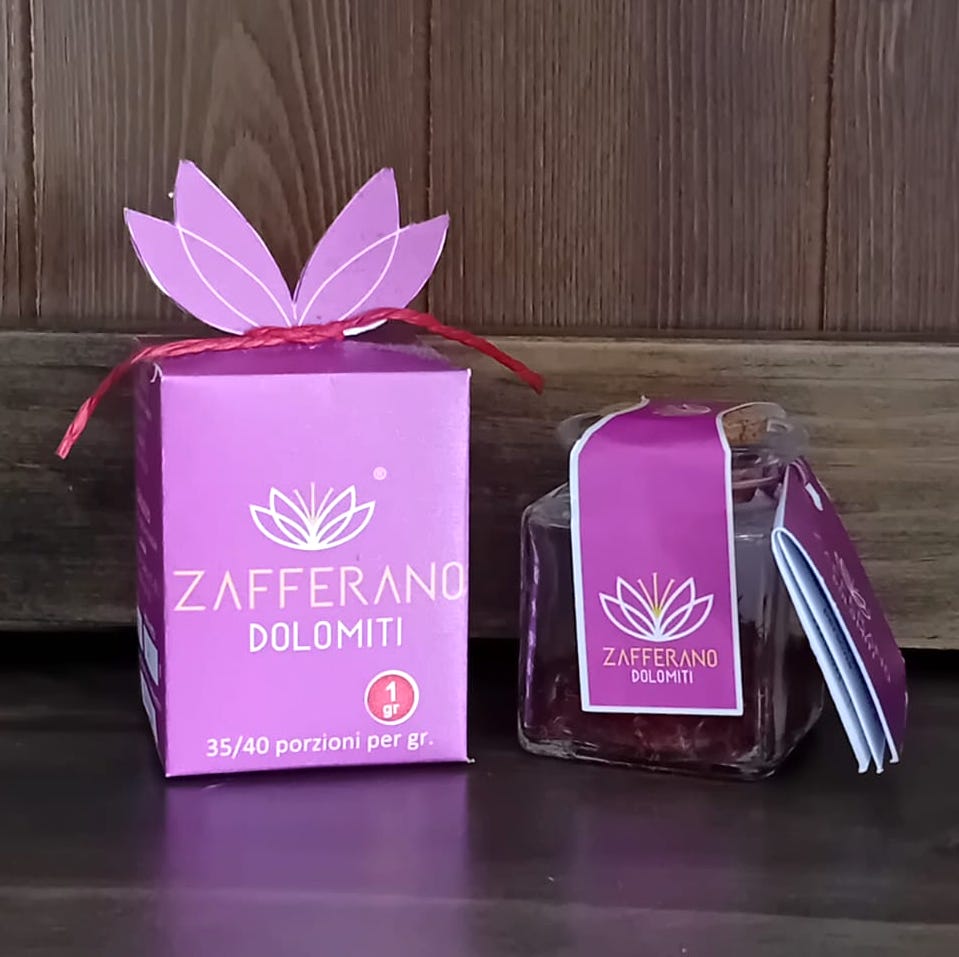 - La porzione di Zafferano Dolomiti decisa, in pistilli e all’interno di contenitori che lo preservano da agenti esterni che lo possono rovinare, quali la luce e l’umidità.